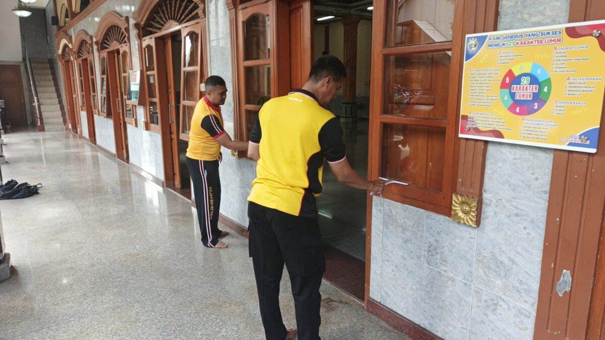 Ngepel lantai masjid dan bersih-bersih lingkungan oleh jajaran Polsek Cengkareng di Masjid LDII dan Ponpes Baitul Muttaqin tersebut dalam rangka memperingati Isra Mi’raj Nabi Besar Muhammad SAW 1447 H/2026,.